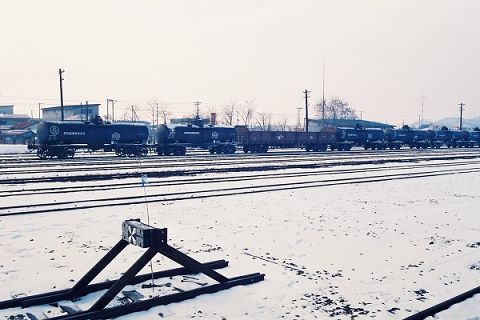 広い構内には寂しく貨車がおかれています。