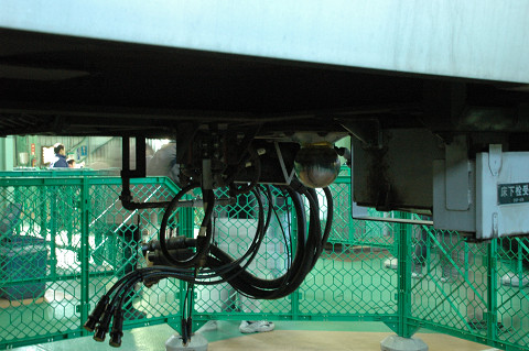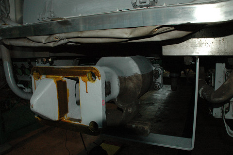 車体吊り上げ実演に戻って、センターピン付近のクローズアップ。